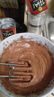Using a fork or handheld mixer, whip in your cocoa, vanilla, and sweetener until well mixed.